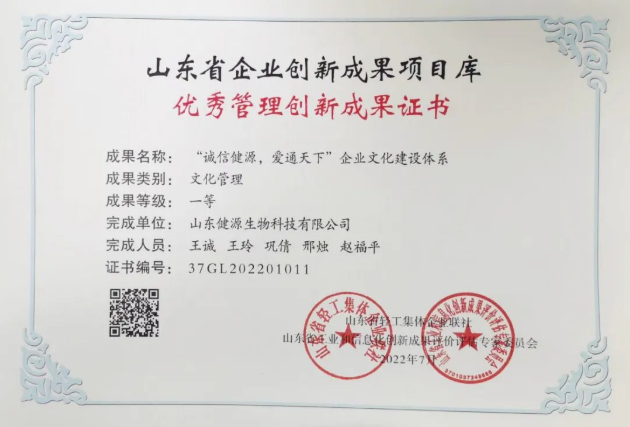 山东健源生物荣获山东省企业创新成果项目库优秀管理创新成果一等奖
