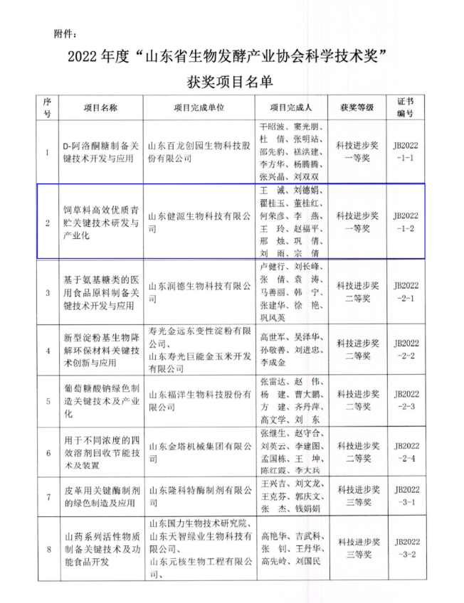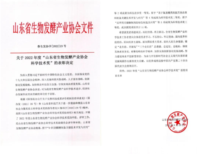 按照《山东省生物发酵产业协会科学技术奖奖励章程》相关规定,开展2022年度山东省生物发酵产业协会科学技术奖的申报、评审工作,经山东省生物发酵产业协会科学技术奖励委员会评审和审核,山东省生物发酵产业协会批准,授予山东健源生物科技有限公司成果为科技进步奖一等奖。