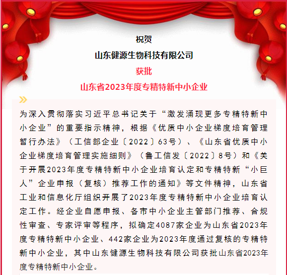 山东健源生物获批山东省2023年度专精特新中小企业