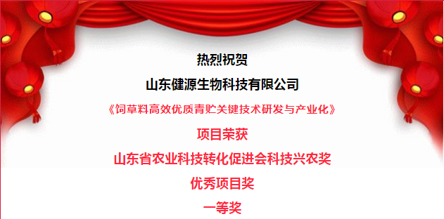 2023年5月27日, 第三届全省科技兴农奖表彰奖励大会在青岛成功举行,会上对在2022年度全省农业科技成果转化工作中涌现的先进集体、先进个人和优秀项目进行表彰,山东健源生物科技有限公司《饲草料高效优质青贮关键技术研发与产业化》项目荣获山东省农业科技转化促进会科技兴农奖优秀项目奖一等奖。
