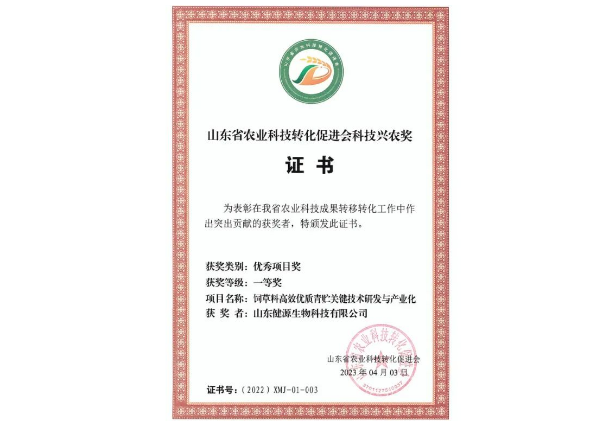 山东健源生物荣获山东省农业科技转化促进会科技兴农奖一等奖