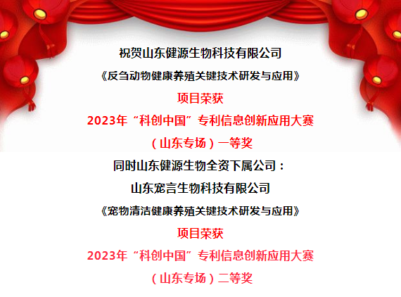 山东健源生物科技有限公司《反刍动物健康养殖关键技术研发与应用》项目荣获2023年“科创中国”专利信息创新应用大赛(山东专场)一等奖,同时山东健源生物全资下属公司:山东宠言生物科技有限公司《宠物清洁健康养殖关键技术研发与应用》项目荣获2023年“科创中国”专利信息创新应用大赛(山东专场)二等奖。