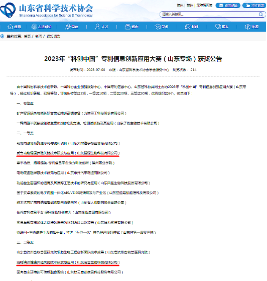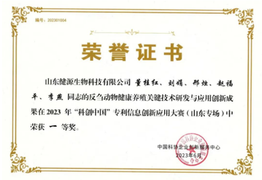 山东健源生物荣获2023年“科创中国”专利信息创新应用大赛(山东专场)一等奖