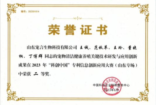 山东宠言生物科技有限公司《宠物清洁健康养殖关键技术研发与应用》项目荣获2023年科创中国专利信息创新应用大赛(山东专场)二等奖