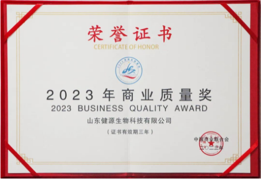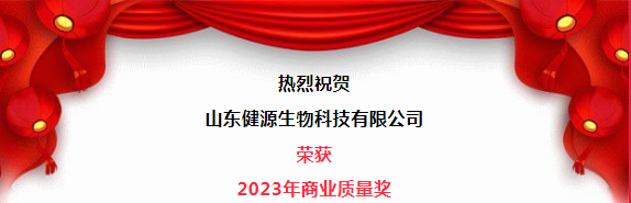 2023年7月30日,由中国商业联合会主办的“2023年全国商业科技质量大会”在北京隆重召开,会议聚焦商业科技创新和高质量发展。大会现场颁发了第十六届中国商业联合会商业质量奖。经商业质量奖评审办公室初步形式审查,组织专家评审及获奖名单公示,决定授予98家单位“第十六届商业质量奖”,山东健源生物科技有限公司荣获“2023年商业质量奖"。
