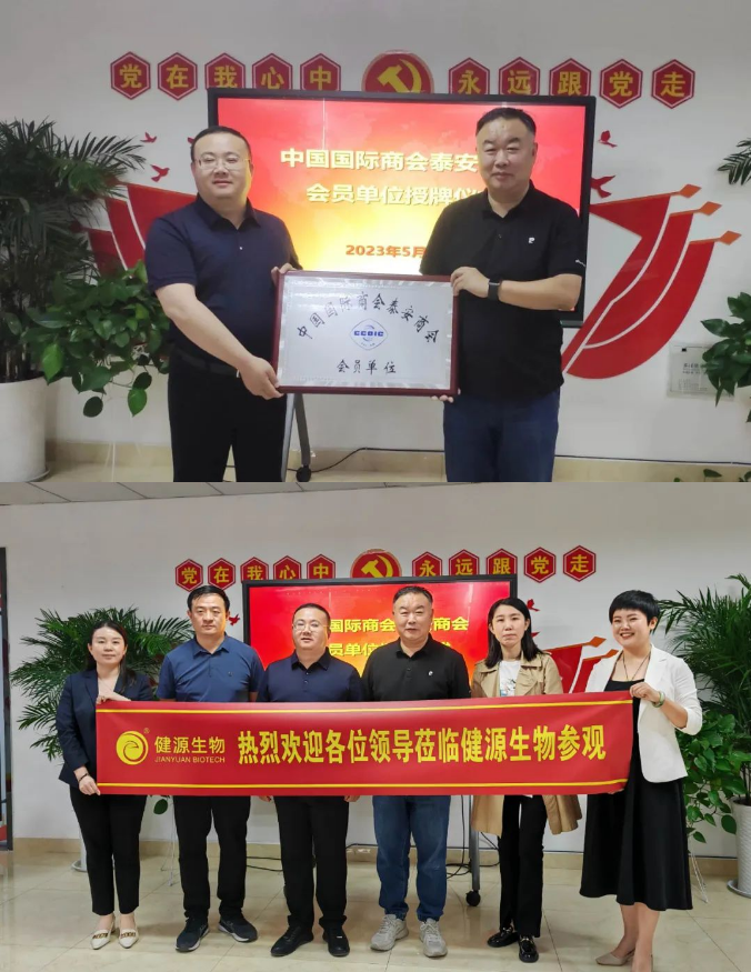 发布时间:[2023-6-28 9:19:4] 浏览量:4318次近日,泰安市国际商会秘书长赵传兵一行四人专程来到山东健源生物科技有限公司参观指导,并授予山东健源生物科技有限公司为“中国国际商会泰安商会会员单位”。