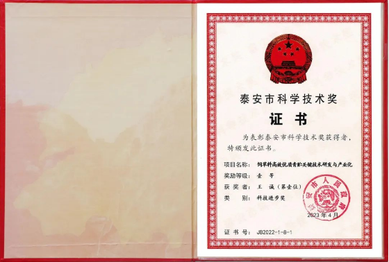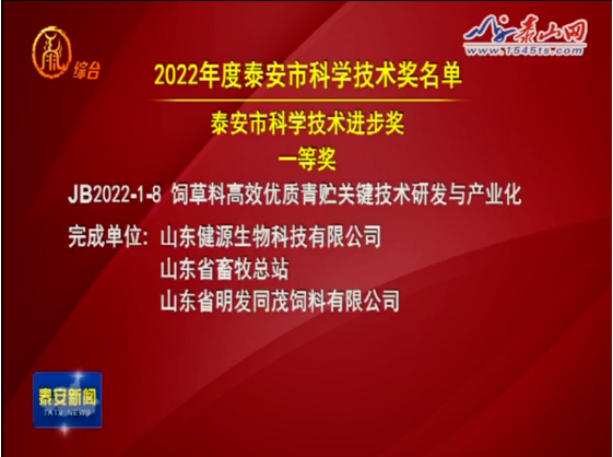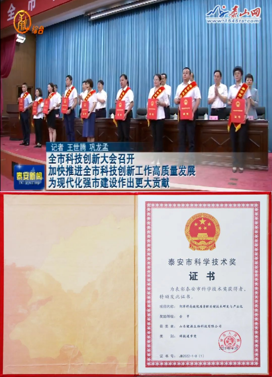 会议宣读了泰安市人民政府《关于2022年度科学技术奖励的决定》和《关于下达2023年泰安市科技创新“双十工程”项目的通知》,并为2022年度科学技术奖获奖代表颁奖。山东健源生物科技有限公司《饲草料高效优质青贮关键技术研发与产业化》项目荣获泰安市科学技术进步奖一等奖。