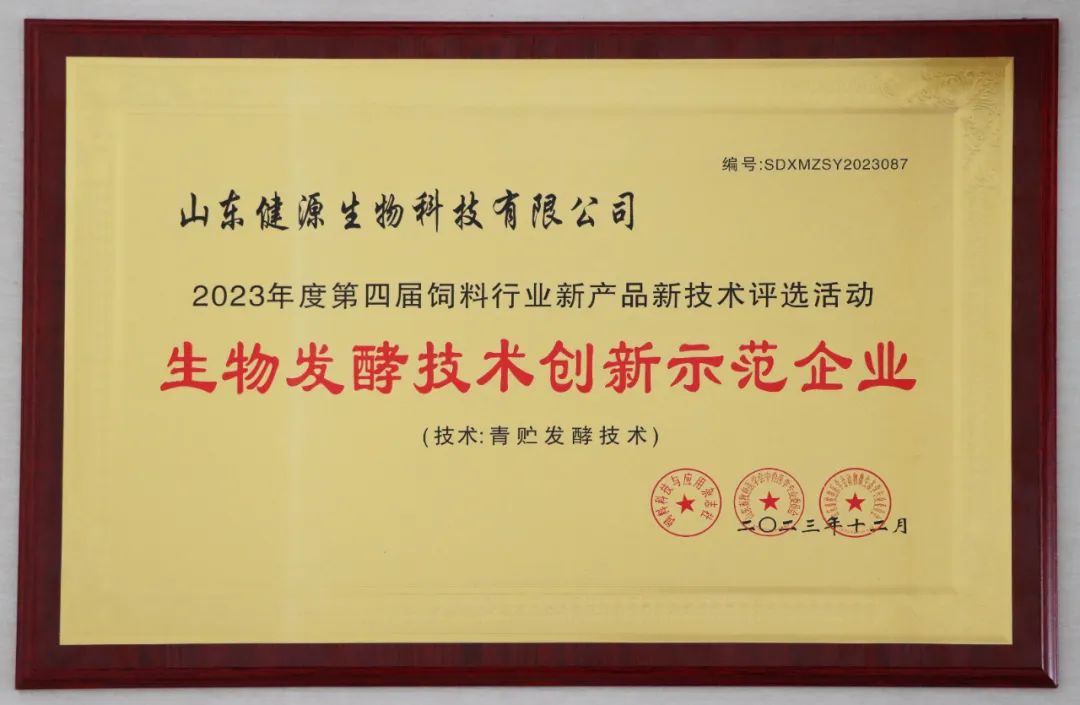12月12日,由山东畜牧医学会主办的第四届青鸟论坛暨2023年度饲料行业新产品新技术研讨发布会在济南举行。山东健源生物科技有限公司获评生物发酵技术创新示范企业。