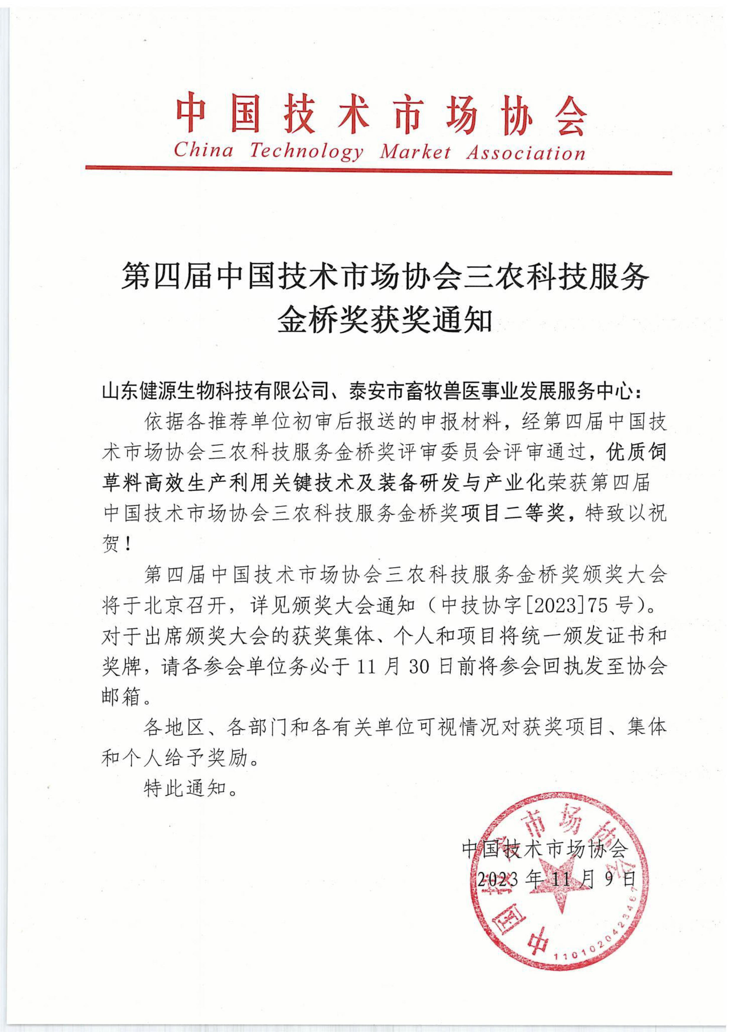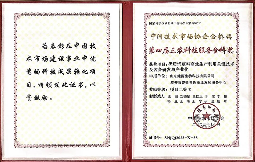 山东健源生物科技有限公司《优质饲草料高效生产利用关键技术及装备研发与产业化》项目荣获中国技术市场协会金桥奖第四届三农科技服务奖项目二等奖。