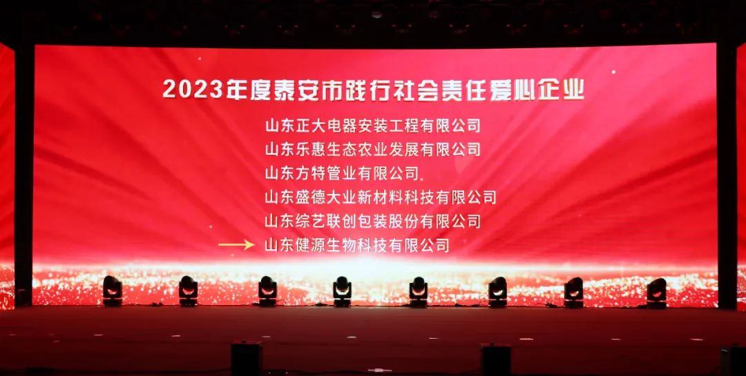 12月29日,2023迎新年银企联谊会暨2023年泰山企业家、泰安市“诚信工作先进企业”、 泰安市践行社会责任爱心企业颁奖盛典隆重举行。大会总结交流全市推进新型工业化和企业创新发展的成就与经验,表彰先进。山东健源生物科技有限公司荣获“泰安市企业文化优秀成果一等奖”、“泰安市诚信工作先进企业”、“泰安市践行社会责任爱心企业”荣誉称号。