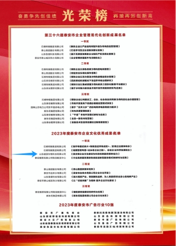 为进一步总结交流企业文化建设的新成果、新经验,介绍企业文化建设的新方法、新特点,展示企业文化建设的新水平、新成就,经市企业文化优秀成果评委会审定,全市10项企业文化成果获“2023年度泰安市企业文化优秀成果”奖,其中,一等奖4项。