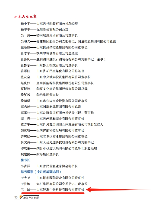 近日,在2023年度山东省民营企业家协会表彰评选活动中,经山东省民营企业家协会三届十六次会长会议研究,报请协会三届五次会员代表大会审议,决定增补山东健源生物科技有限公司董事长王诚为山东省民营企业家协会第三届理事会常务理事。