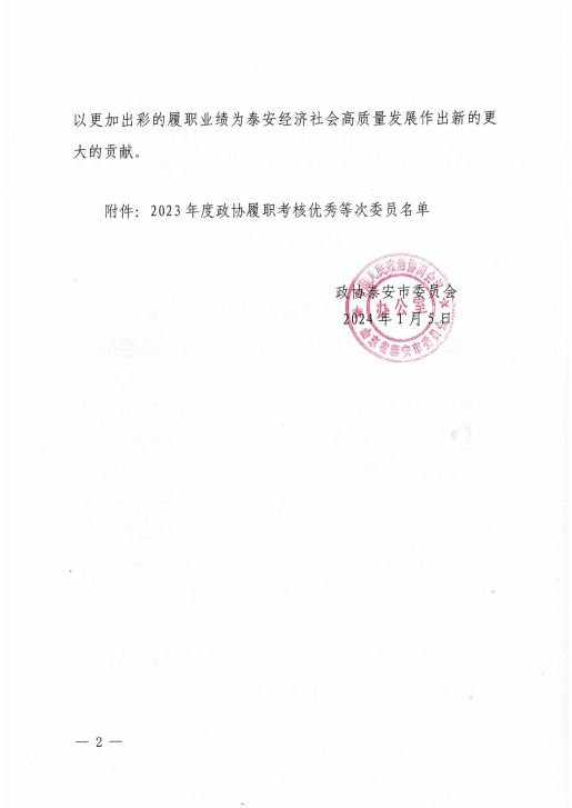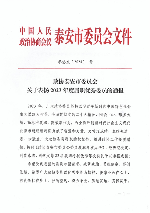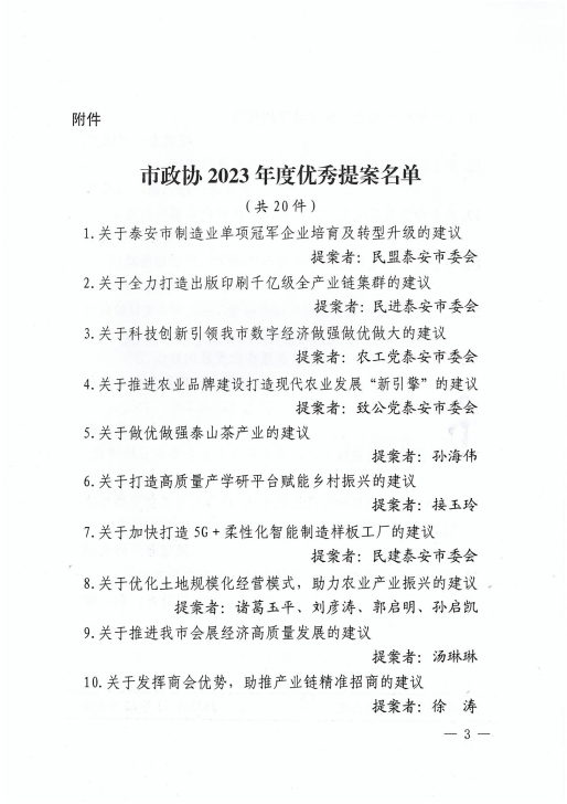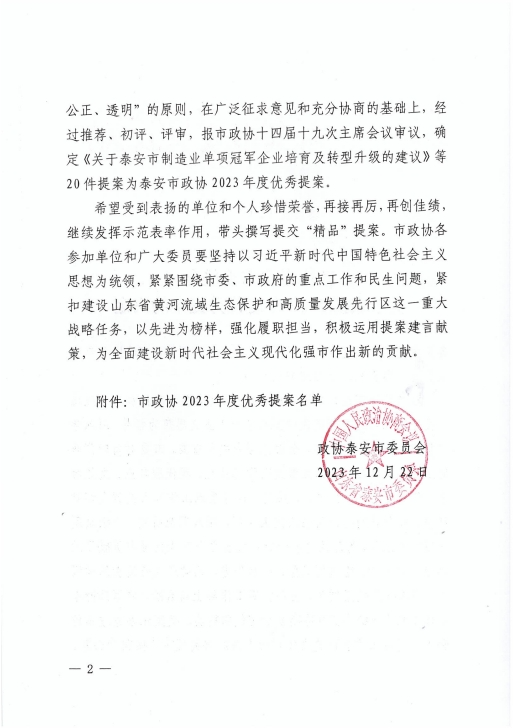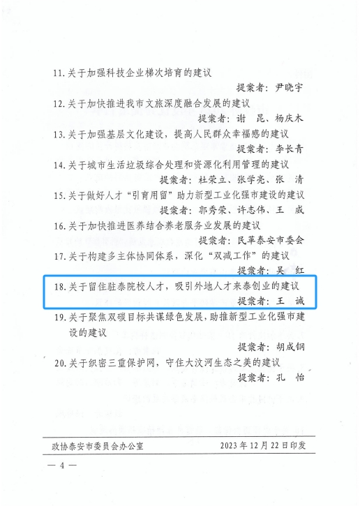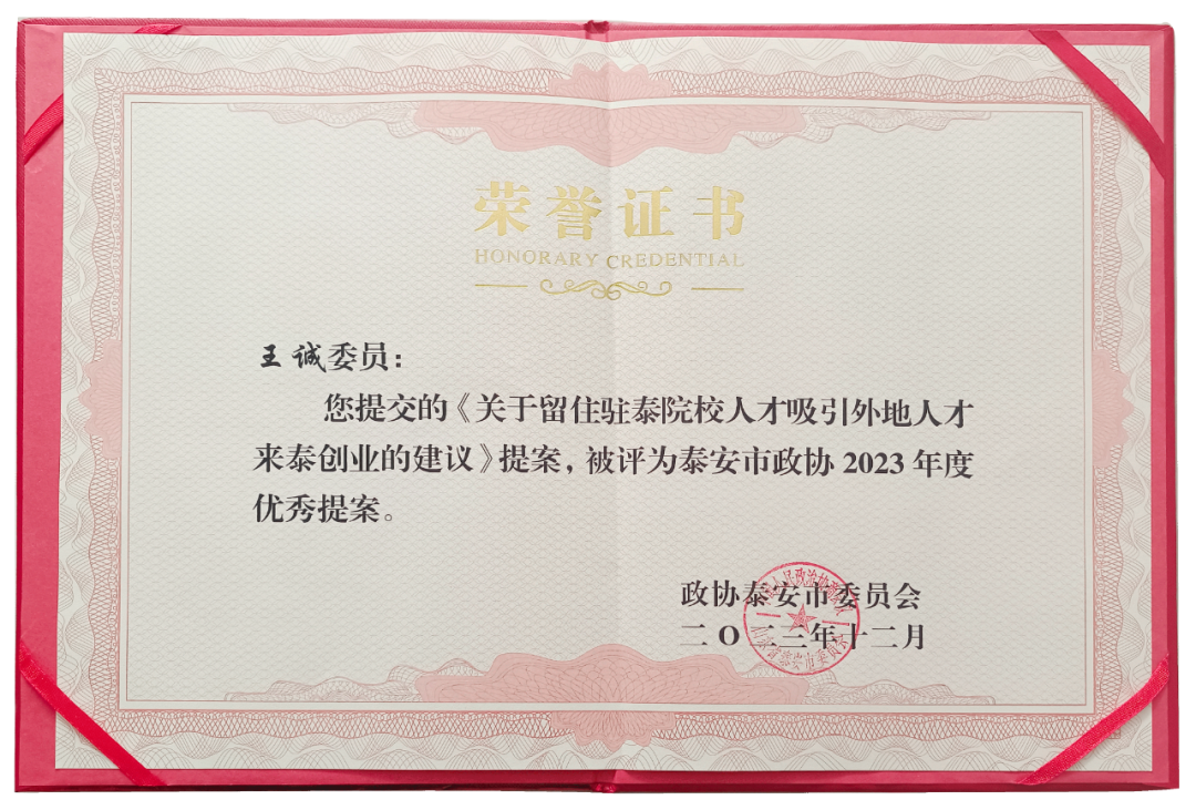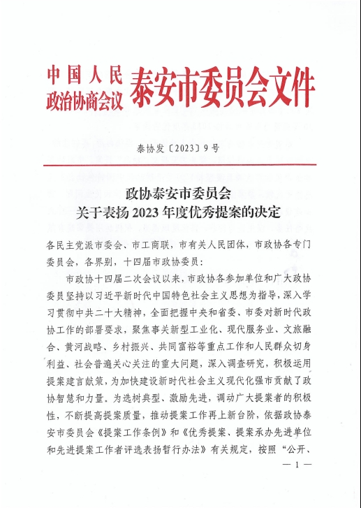 在会上,政协泰安市委员会发布了关于表扬2023年度优秀提案的决定,王诚董事长《关于留住驻泰院校人才,吸引外地人才来泰创业的建议》被选为优秀提案。