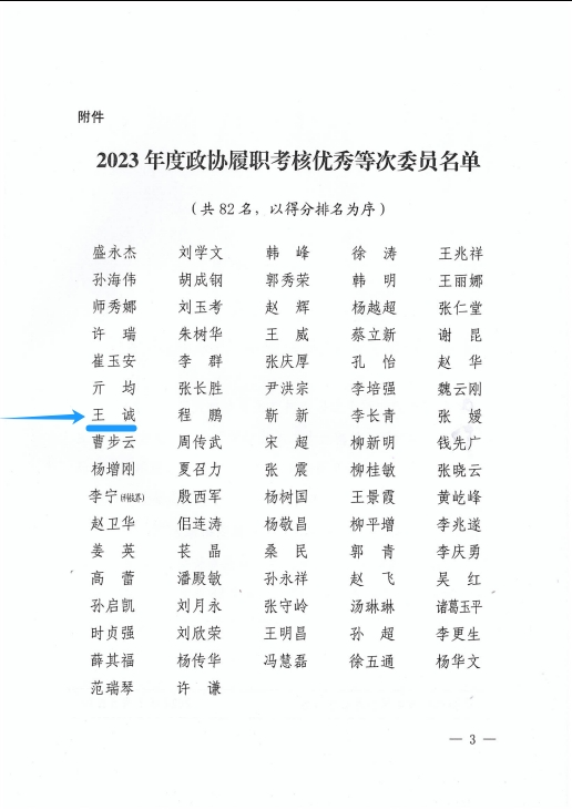 2023年,广大政协委员坚持以习近平新时代中国特色社会主义思想为指导,全面贯彻党的二十大精神,围绕中心、服务大局、高标准履职、高效率作为,为全面开创新时代社会主义现代化强市建设新局面贡献了智慧和力量。为表扬先进,会上公布了2023年度政协履职考核优秀等次委员名单,董事长王诚光荣上榜!