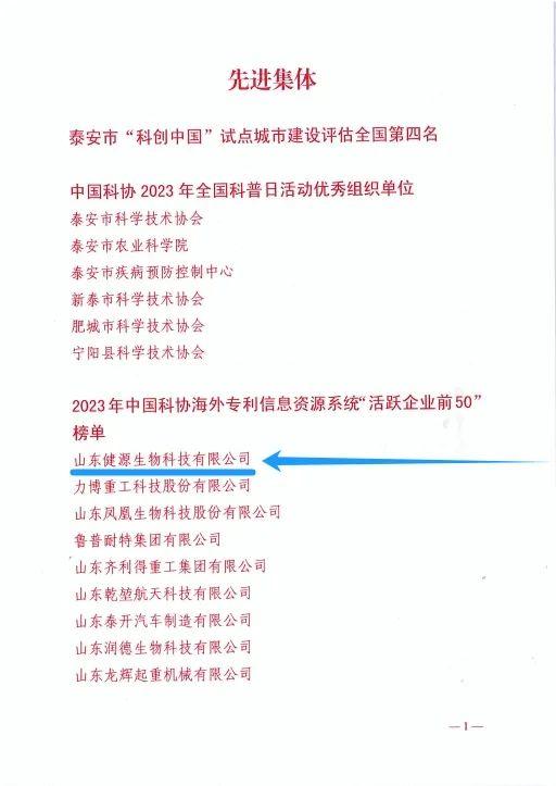 健源生物入选2023年中国科协海外专利信息资源系统“活跃企业前50”榜单