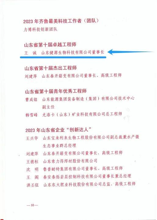 董事长王诚荣获山东省第十届卓越工程师