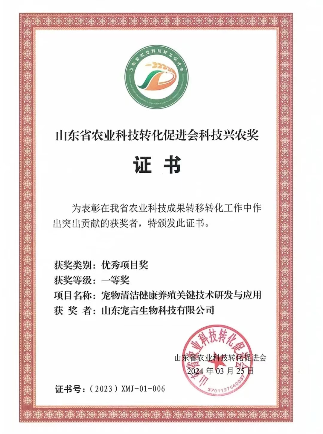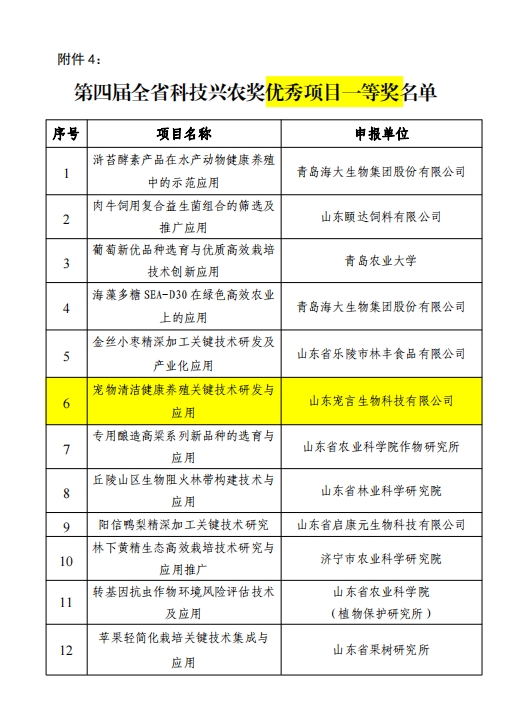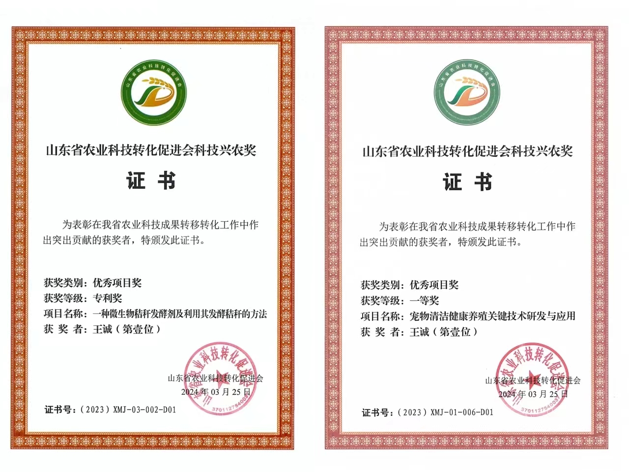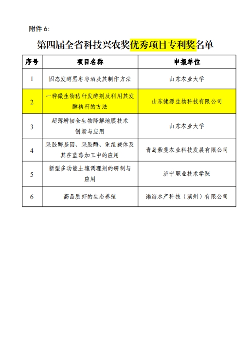 山东健源生物科技有限公司申报的《一种微生物秸秆发酵剂及其发酵秸秆的方法》项目获得山东省农业科技转化促进会科技兴农奖优秀项目奖专利奖。健源生物旗下子公司山东宠言生物科技有限公司申报的《宠物清洁健康养殖关键技术研发与应用》项目获得山东省农业科技促进会科技兴农奖优秀项目奖一等奖,董事长王诚为两个项目的第一完成人。