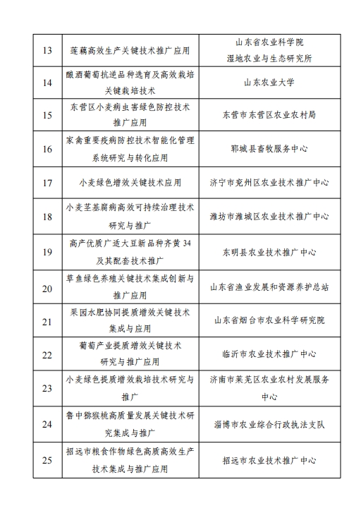 根据《山东省农业科技转化促进会科技兴农奖奖励章程》的有关规定,经过评审委员会评审、奖励委员会审定,评审出了第四届全省科技兴农奖先进集体10个、先进个人20人、优秀项目特等奖2项、优秀项目一等奖36项,优秀项目二等奖56项、优秀项目专利奖6项。