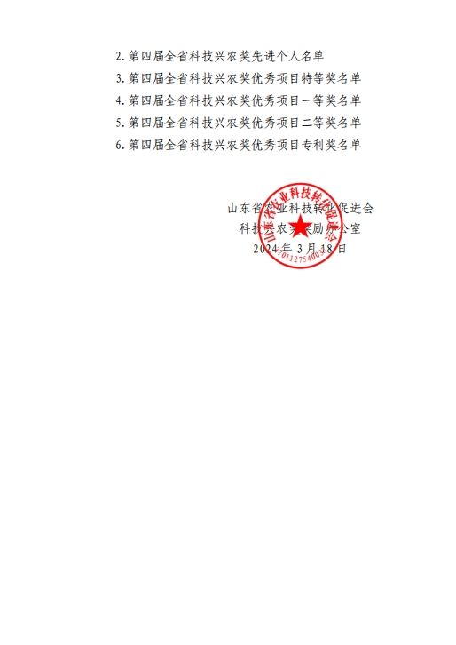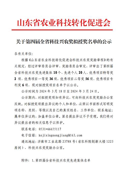 “科技兴农奖”由山东省农业科技转化促进会于2020年设立,旨在表彰和鼓励为农业科技成果转移转化作出突出贡献的个人和集体,加快促进农业科技成果转化为现实生产力,助力打造科技支撑型乡村振兴齐鲁样板。