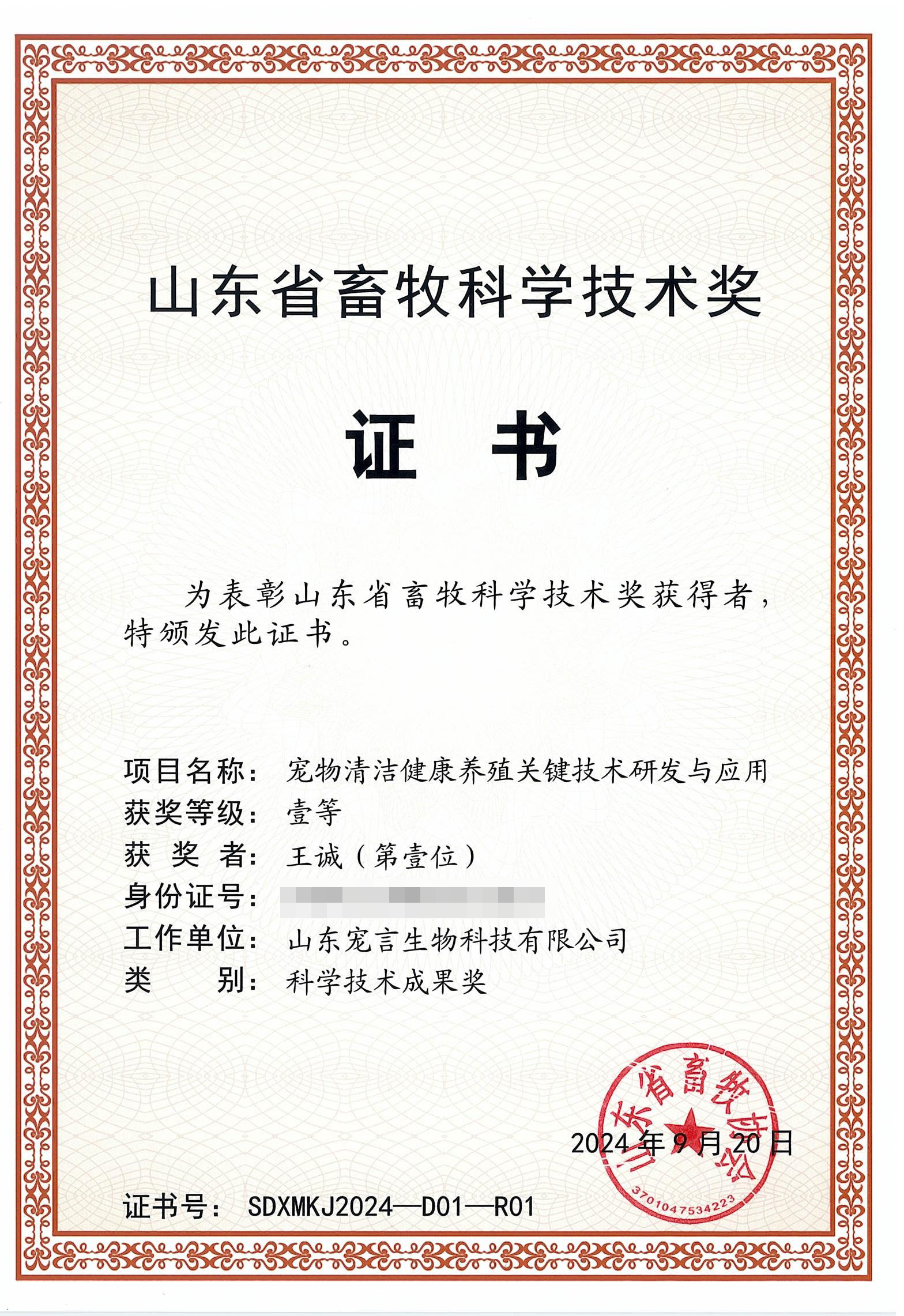 近日,山东省畜牧协会公布了2024年山东省畜牧科学技术奖获奖名单。山东健源生物科技有限公司与子公司山东宠言生物科技有限公司共同完成的“宠物清洁健康养殖关键技术研发与应用”项目,凭借其创新性与实用性,荣获山东省畜牧科学技术奖科学技术成果奖一等奖。