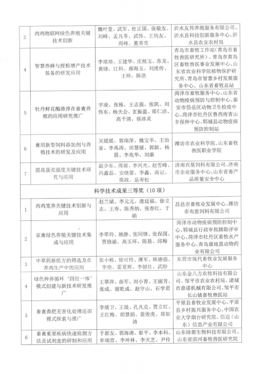 按照《山东省畜牧科学技术奖奖励管理办法》的规定,为表彰奖励在我省畜牧技术科技研发和推广中作出贡献的单位和个人,经过评审,评选出山东省畜牧科学技术奖技术成果奖一等奖5个,二等奖7个,三等奖10个。