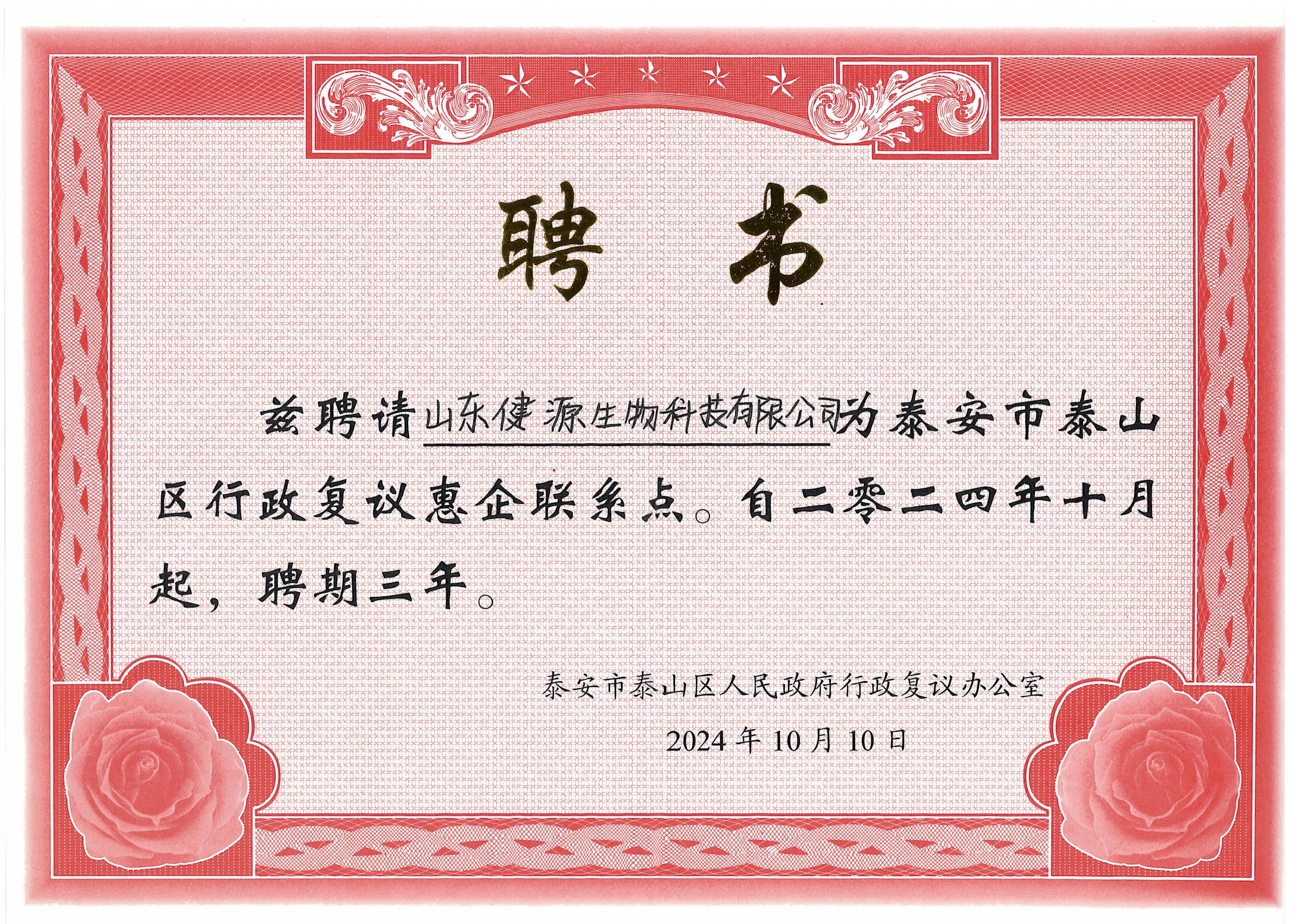 仪式上,泰山区司法局党组书记、局长周萍萍宣读了《泰山区关于设立行政执法监督企业联系点和聘请行政执法监督员的决定》,与会领导为行政执法监督企业联系点和监督员代表颁发牌匾证书。山东健源生物科技有限公司被泰山区司法局聘请为泰安市泰山区行政执法监督企业联系点、行政复议惠企联系点。