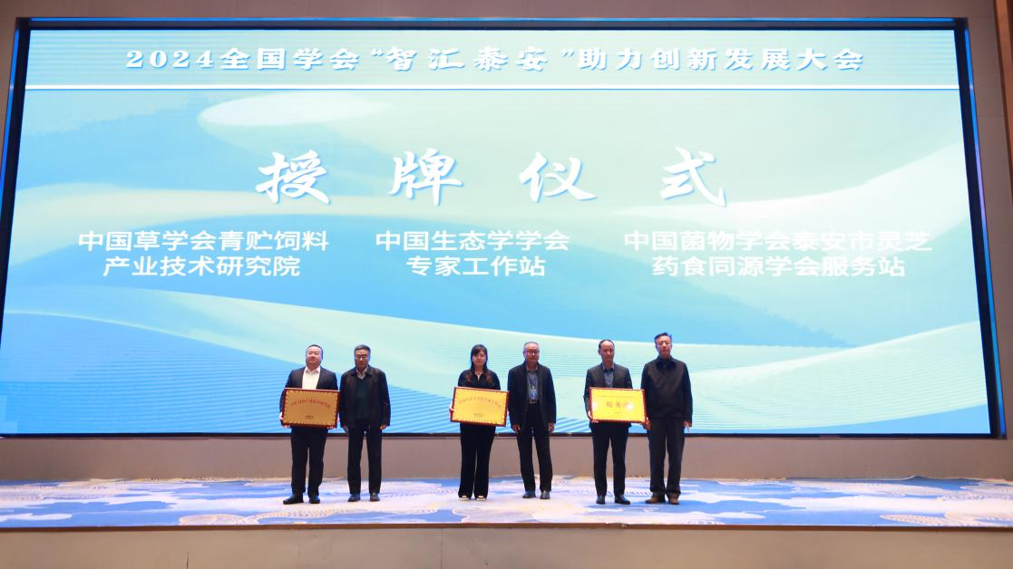 会前,中国检验检测学会等11家全国学会分别深入40余家企业实地指导调研,征集企业技术需求,确定了技术服务等一系列合作事项。与会专家领导共同为青贮饲料产业技术研究院、中国生态学学会专家工作站、中国菌物学会泰安市灵芝药食同源学会服务站、山东汽车工程学会助力企业创新驱动发展服务站等19个平台授牌。中国草学会青贮饲料产业技术研究院落户山东健源生物科技有限公司,中国农业大学草业科技学院、中国草学会副理事长王堃教授为健源生物授牌,健源生物董事长王诚上台接受牌匾。