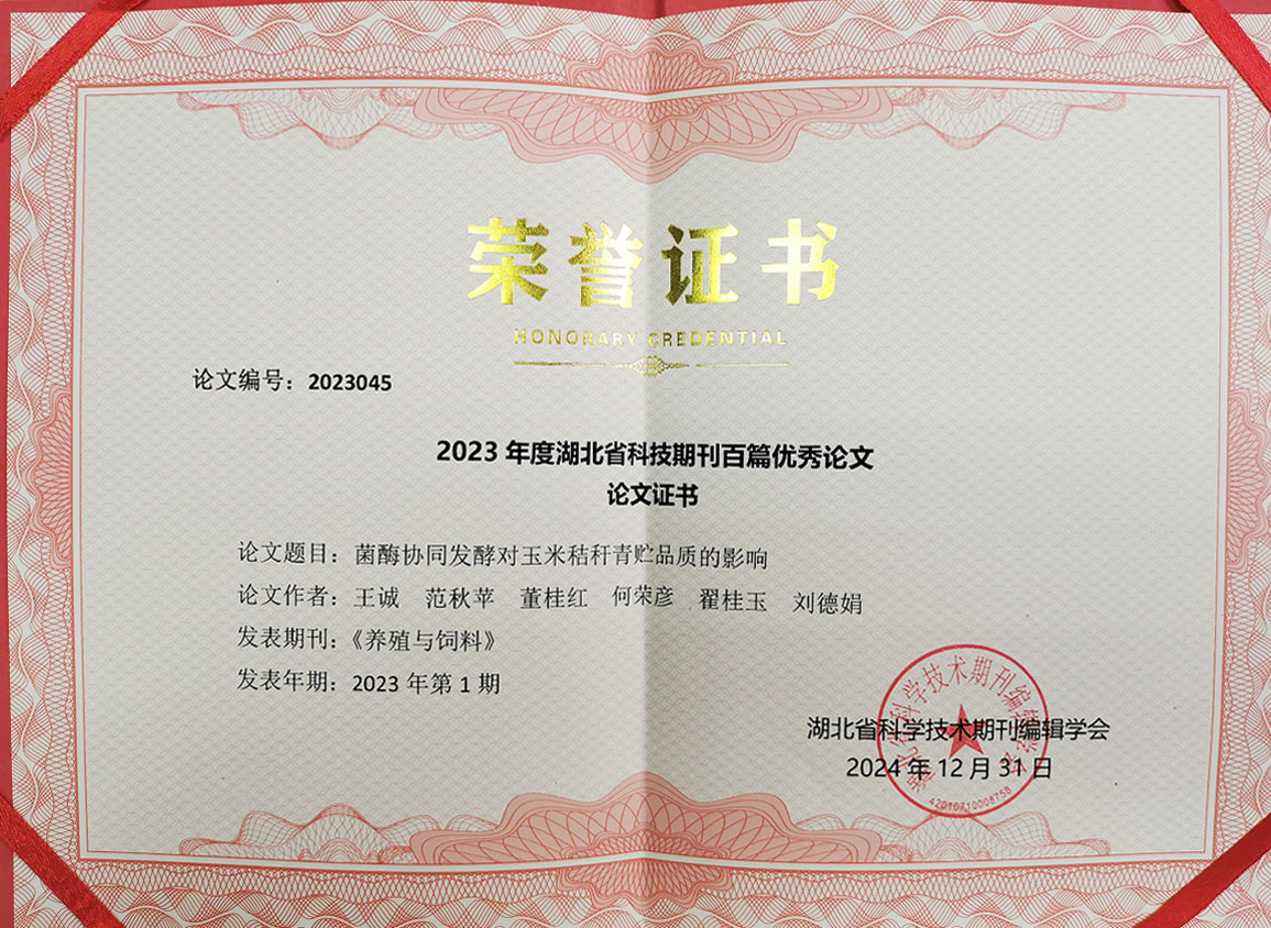2025-1-15 健源生物发表在《养殖与饲料》的论文入选2023年度湖北省科技期刊百篇优秀论文