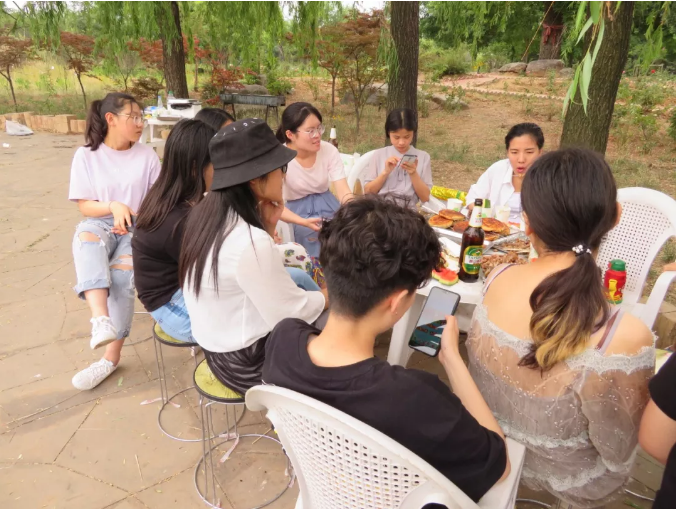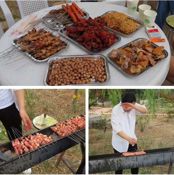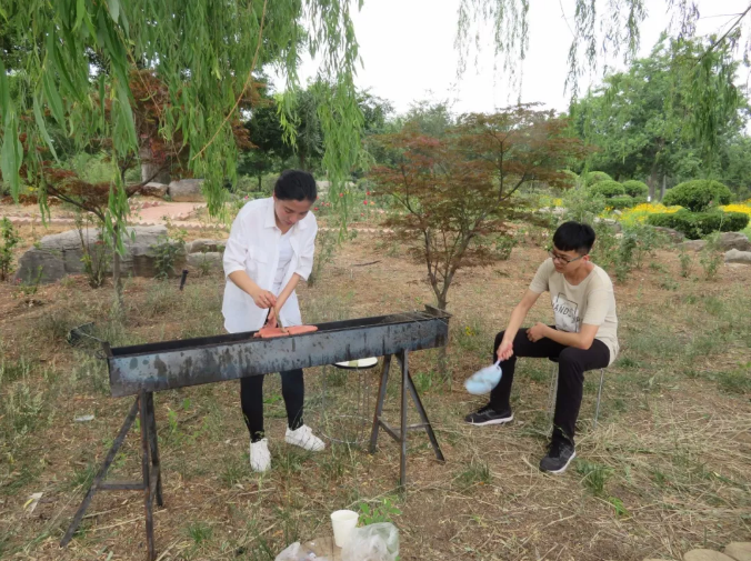 烧烤过程中女同学互相配合着串肉,男同学则忙着生火、加炭,场面热闹。大家都拿出了“十八般武艺”,展示出自己的动手能力和美食鉴赏能力,每个人笑容满面,洋溢着喜悦的气氛。
