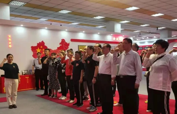 在中共七届二中全会旧址前,党员同志面对党旗庄严宣誓,重温入党神圣时刻。