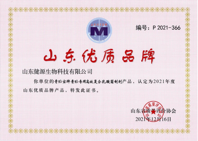 祝贺山东健源生物“青贮宝牌青贮专用复合乳酸菌制剂产品”被认定为2021年度山东优质品牌产品