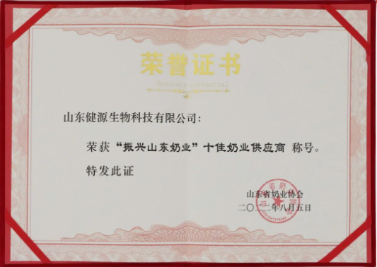 山东健源生物科技有限公司荣获“振兴山东奶业”十佳奶业供应商 称号