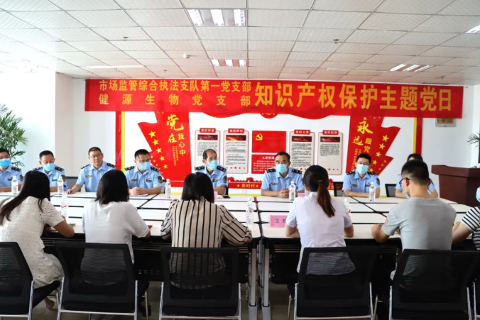 服务经济发展,赋能强市建设。2022年9月2日,山东健源生物党支部与泰安市市场监管综合执法支队党支部联合开展"知识产权保护主题党日"活动,增强企业知识产权保护意识。泰安市市场监管综合执法支队副支队长孙凤明、任常平带领第一支部12名党员参加,山东健源生物行政副总经理王玲、技术研发部主任董桂红等相关部门负责人一同参与活动。
