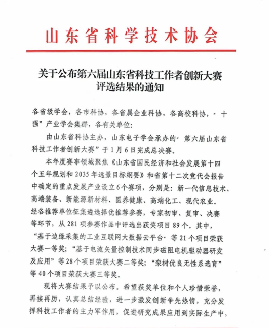 由山东省科协主办,山东电子学会承办的"第六届山东省科技工作者创新大赛”1月6日完成总决赛。本年度赛事领域聚焦《山东省国民经济和社会发展第十四个五年规划和2035年远景目标纲要》和省第十二次党代会报告中确定的重点发展产业设立6个赛项,分别是:新一代信息技术、高端装备、新能源新材料、医养健康、高端化工、现代农业。经各推荐单位征集遴选择优推荐参赛,专家初审、复审、决赛等环节,从281项参赛作品中评选出获奖项目89个。其中,山东健源生物科技有限公司《饲草料高效优质青贮关键技术研发与产业化》项目荣获第六届科技工作者创新大赛二等奖。