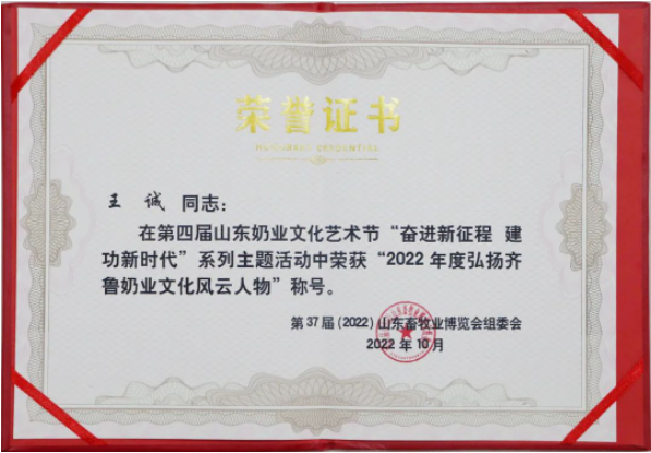 山东健源生物董事长王诚荣获“2022年度弘扬齐鲁奶业文化风云人物”称号