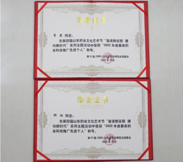 山东健源生物技术部总监李燕、外宣部主任邢烛荣获“2022年度最美奶业科技推广先进个人”称号