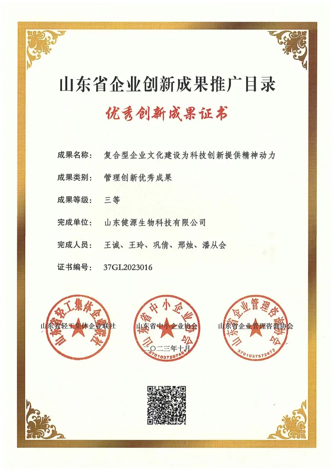 近日,山东省轻工集体企业联社公布了《2023年企业创新优秀成果推广目录名单》。山东健源生物科技有限公司的“复合型企业文化建设为科技创新提供精神动力”荣获管理创新优秀成果证书,并成功入选了山东省企业创新成果推广目录。