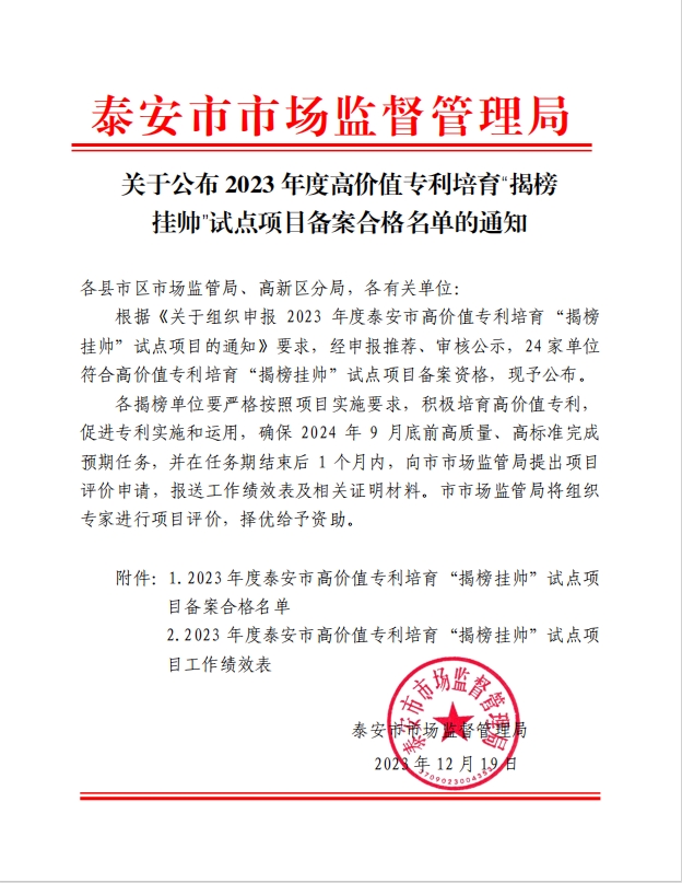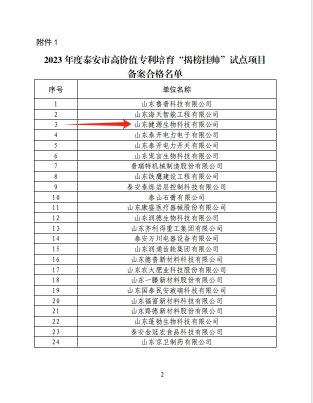 日前,泰安市市场监督管理局根据《关于组织申报2023年度泰安市高价值专利培育“揭榜挂帅”试点项目的通知》要求,经过申报推荐、审核公示,我市24家单位符合备案资格。山东健源生物科技有限公司成功入选2023年度高价值专利培育“揭榜挂帅”试点项目备案合格名单。