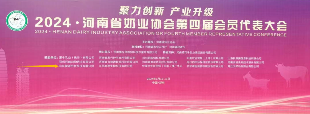 2024年1月12-13日,由河南省奶业协会主办、河南省农业农村厅、河南省民政厅支持的2024河南奶业协会第四届会员代表大会在郑州举行。农业农村部相关业务部门领导、河南省农业农村厅奶业管理处相关领导、行业协会领导、国内知名行业专家、奶业相关产业代表200余人参加此次大会。山东健源生物科技有限公司作为赞助单位参加此次大会。