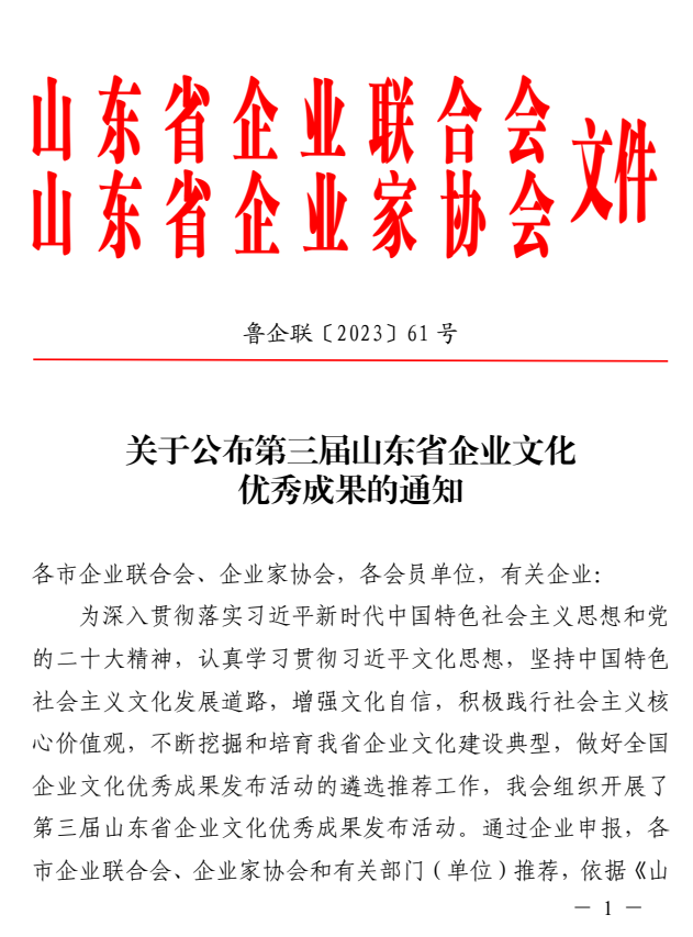 本次企业文化成果评选活动由山东省企业联合会、山东省企业家协会主办,为深入贯彻落实习近平新时代中国特色社会主义思想和党的二十大精神,认真学习贯彻习近平文化思想,坚持中国特色社会主义文化发展道路,增强文化自信,积极践行社会主义核心价值观,不断挖掘和培育我省企业文化建设典型,做好全国企业文化优秀成果发布活动的遴选推荐工作。通过推出一批把握文化方向、时代脉搏的企业文化优秀成果,坚定广大企业以文化强企之路,充分发挥企业文化在企业发展中的作用。