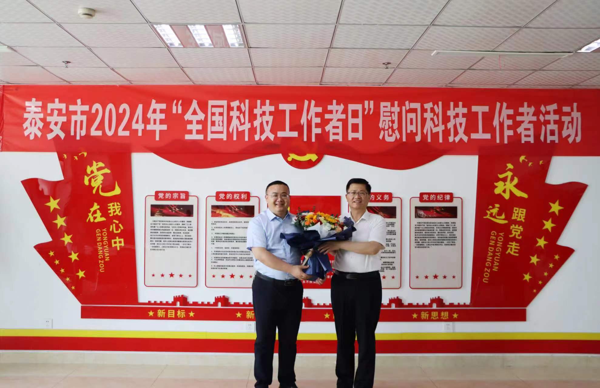 5月24日上午,泰安市科协党组成员、副主席范宝品带队到山东健源生物科技有限公司慰问2023年度“齐鲁最美工程师”获得者王诚董事长,赠送鲜花,并致以节日的问候和祝福。