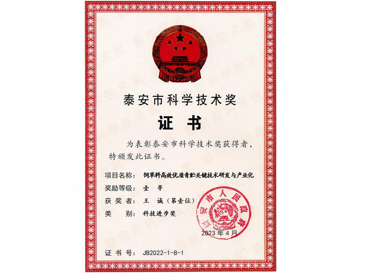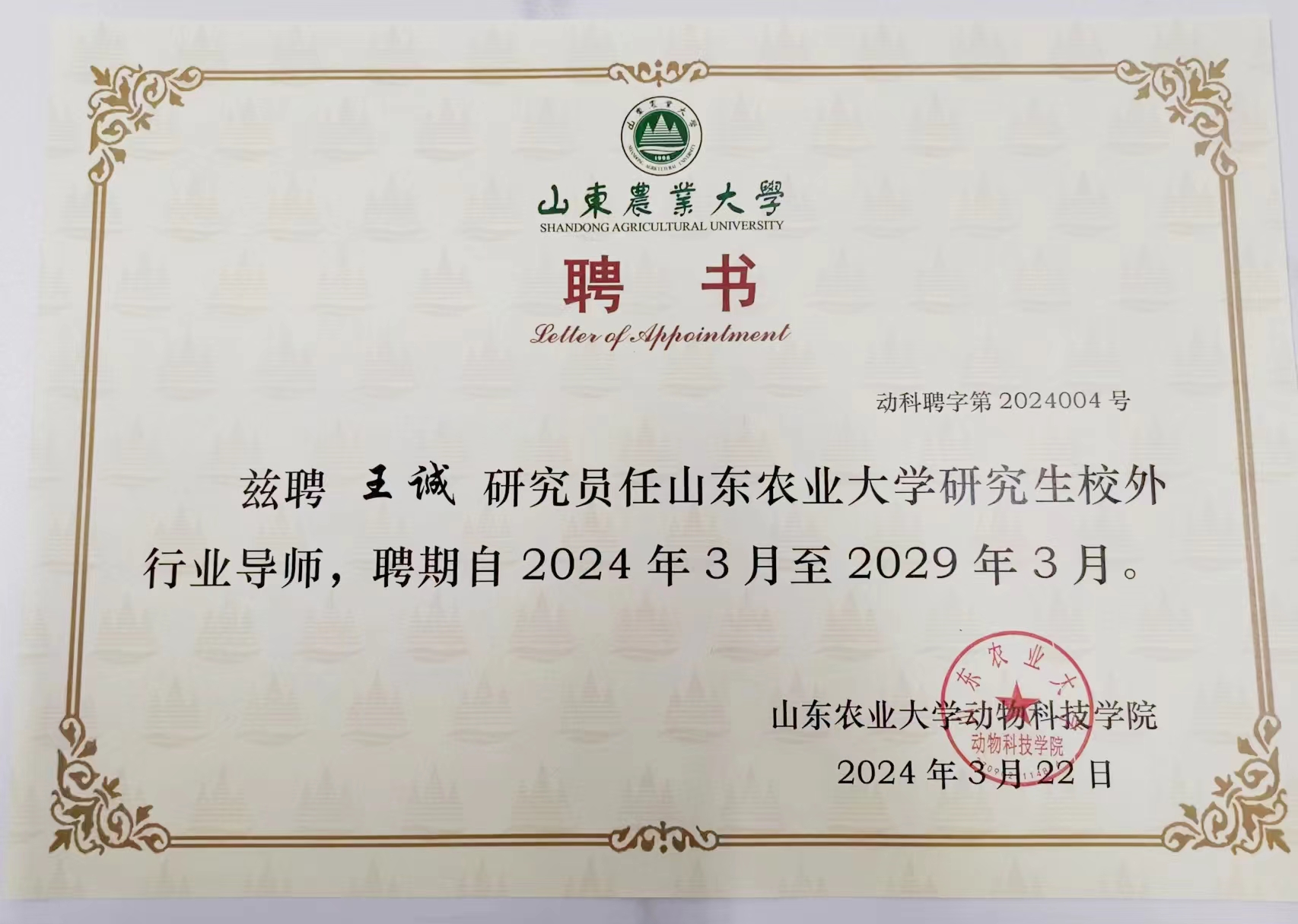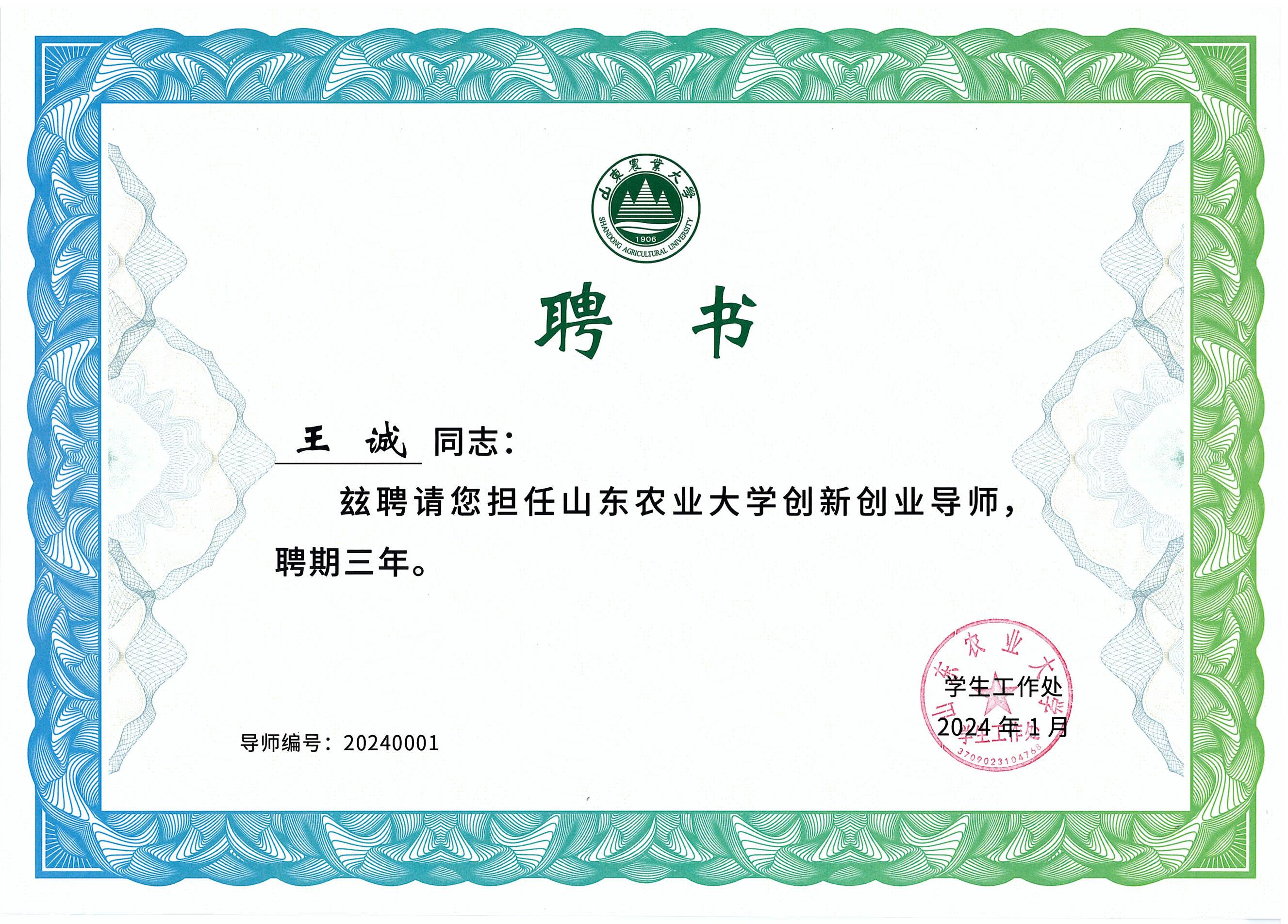 在创新创业之路上,王诚董事长一步一脚印,以实际行动践行科技工作者精神,取得了一系列科研技术和成果突破,被聘请为“中国科协科技人才奖项评审专家”。2023年荣获泰安市青年科技创新奖,作为项目第一完成人荣获泰安市科学技术奖科技进步一等奖,2024年4月荣获“齐鲁最美工程师”称号。被山东农业大学聘请为“创新创业导师”和“研究生校外行业导师”。