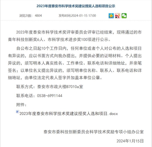 作为项目第一完成人荣获泰安市科学技术进步一等奖