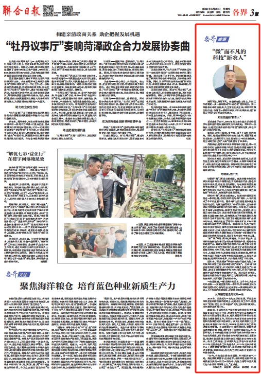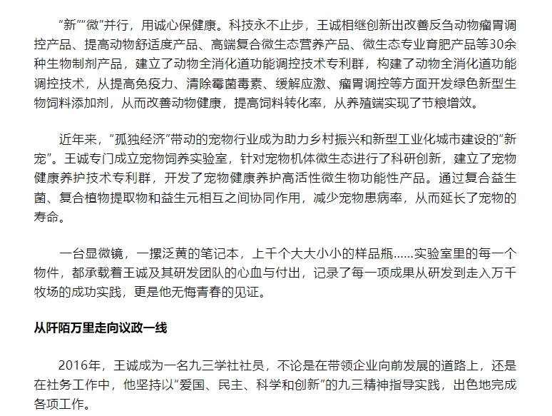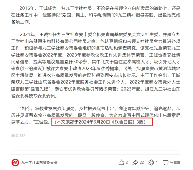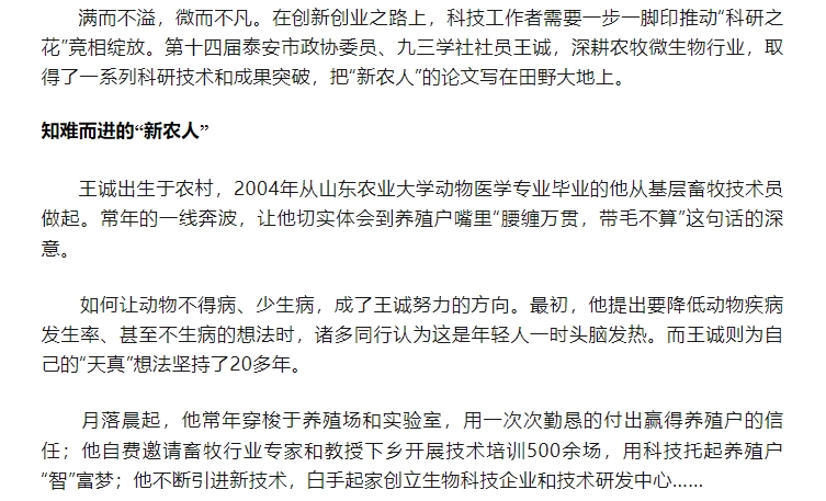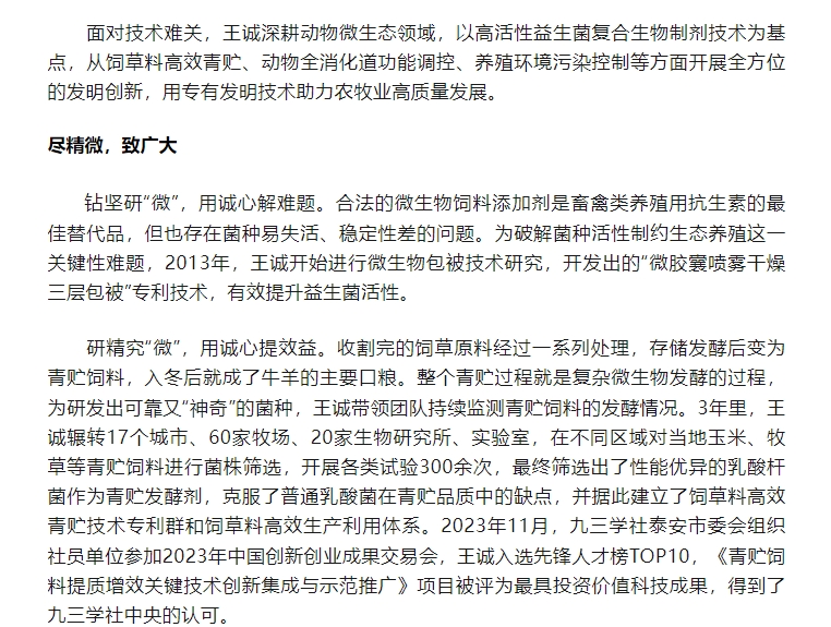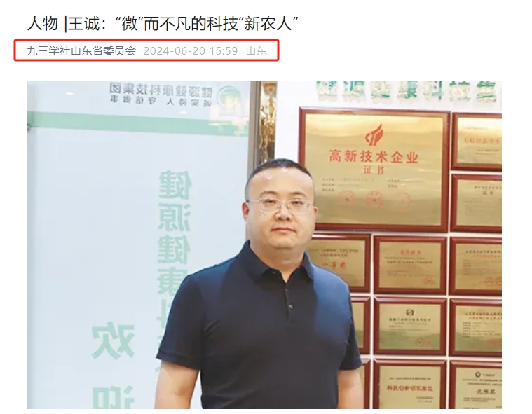 日前,王诚董事长接受了联合日报记者的采访,报道发表在2024年6月20日《联合日报》3版,讲述了王诚董事长作为“新农人”,20多年来深耕微生态领域,以高活性益生菌符合生物制剂技术为基点,从饲草料高效青贮、动物全消化道功能调控、养殖环境污染控制等方面开展全方位的发明创新,用专有发明技术助力农牧业高质量发展。而作为一名九三学社社员,王诚董事长坚持以“爱国、民主、科学和创新”的九三精神指导实践,出色地完成各项工作。该报道同时被九三学社山东省委员会转载报道。