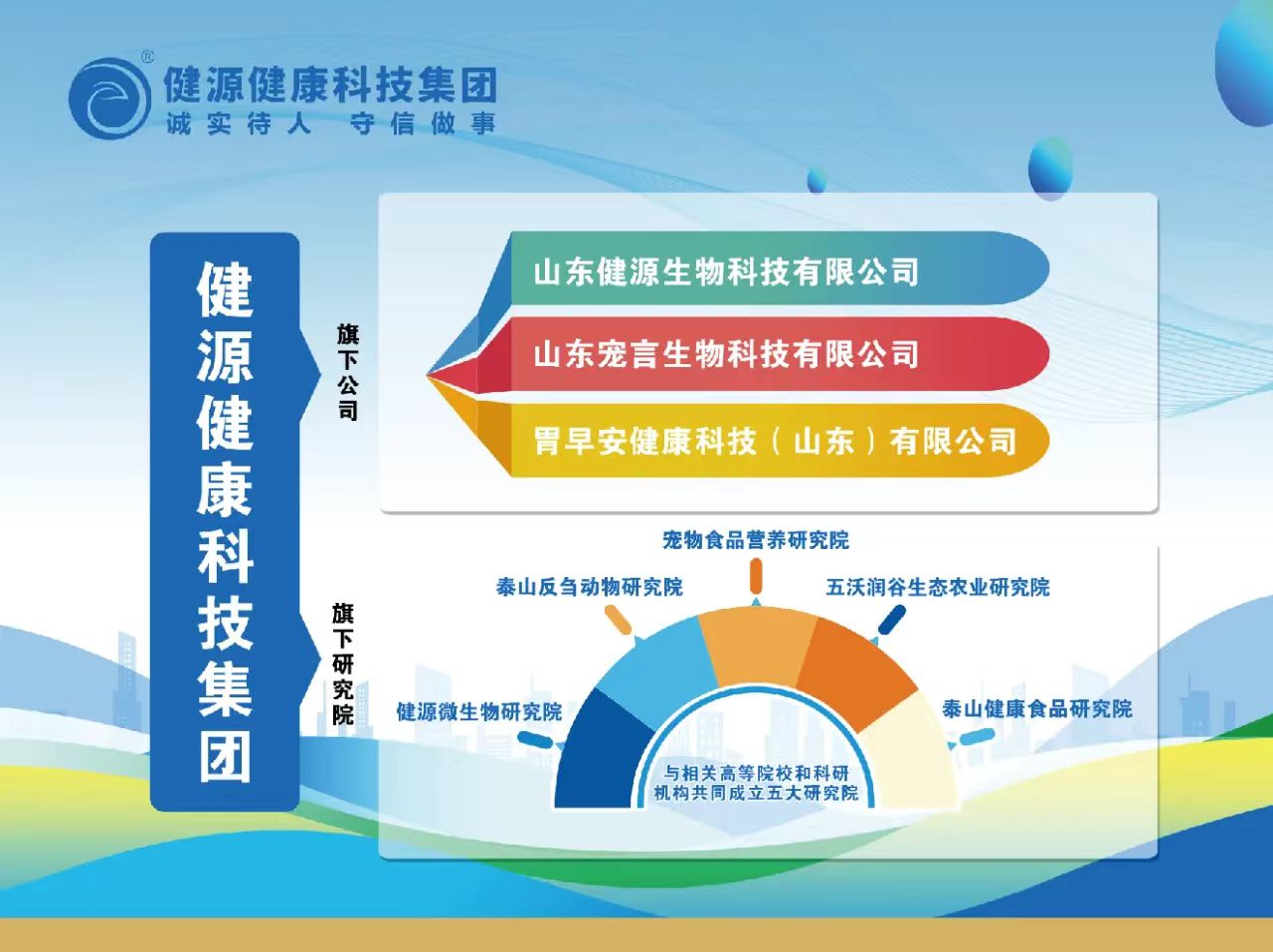 为优化产业结构,扩大公司规模,提升企业的综合实力和竞争能力,健源健康科技(山东)集团有限公司已于四月份在行政审批局正式注册成立,王诚董事长在会上详细介绍了健源健康科技集团,集团旗下拥有山东健源生物科技有限公司、山东宠言生物科技有限公司、胃早安健康科技(山东)有限公司等相关联公司,与相关高等院校和科研机构共同成立健源微生物研究院、泰山健康食品研究院等五大研究院,专注生物科技在大健康相关领域开展技术应用研发、生产及销售。