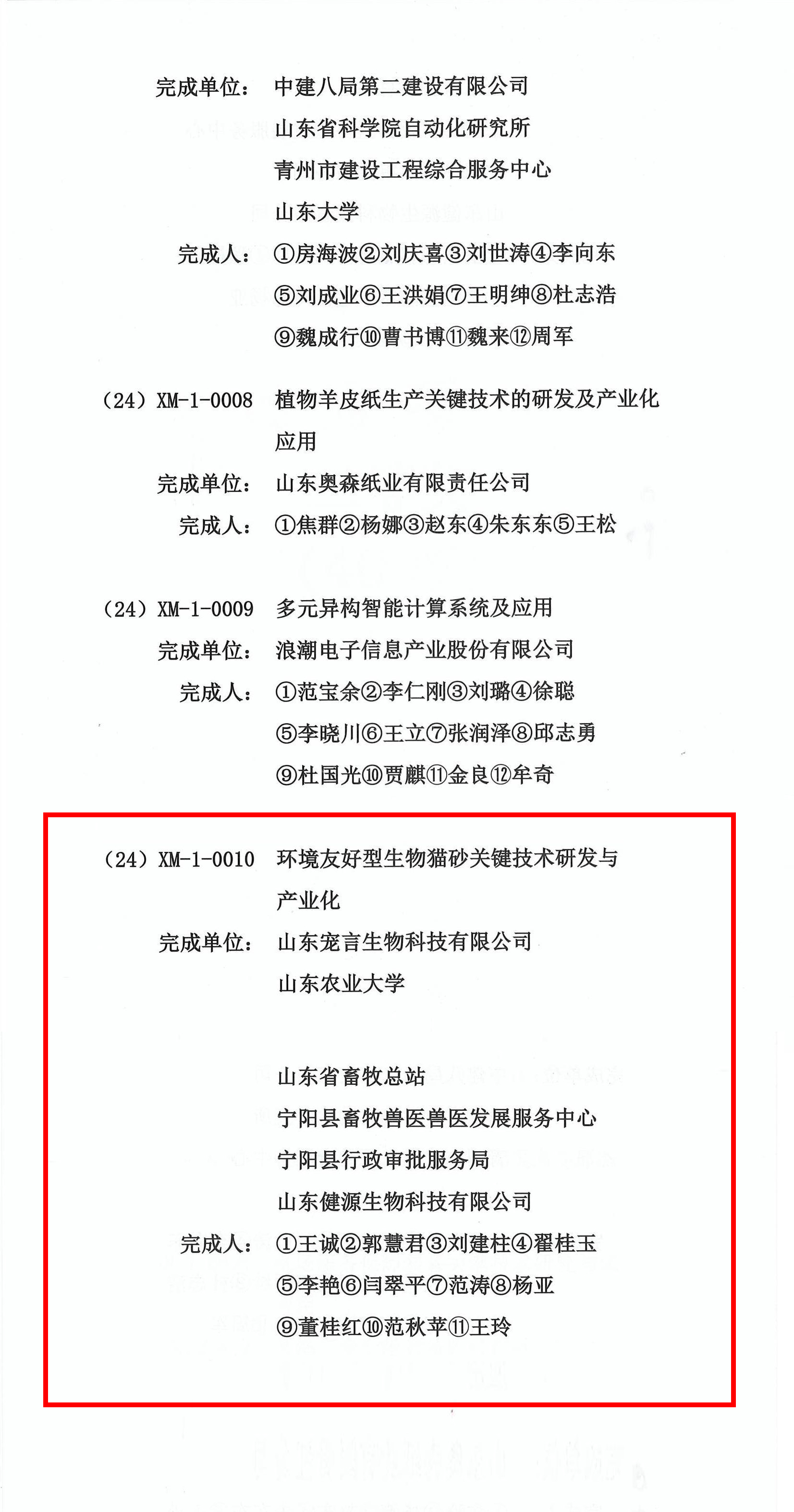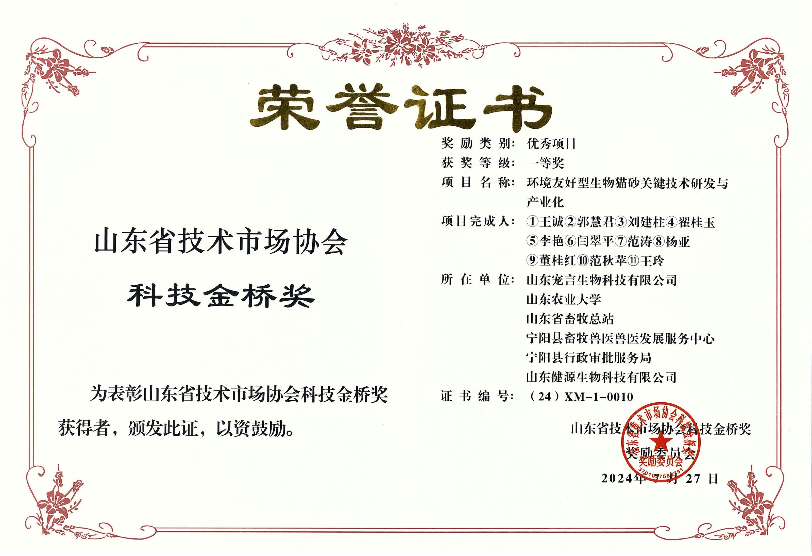 8月30日,2024年度山东省科技金桥奖表彰奖励大会暨山东创新驱动发展高端论坛在山东省干部学院成功举办。山东健源生物科技有限公司与子公司山东宠言生物科技有限公司共同完成的“环境友好型生物猫砂关键技术研发与产业化”项目,经过专业组评审、评审委员会评审、奖励委员会终审,最终荣获山东省技术市场协会科技金桥奖优秀项目一等奖。