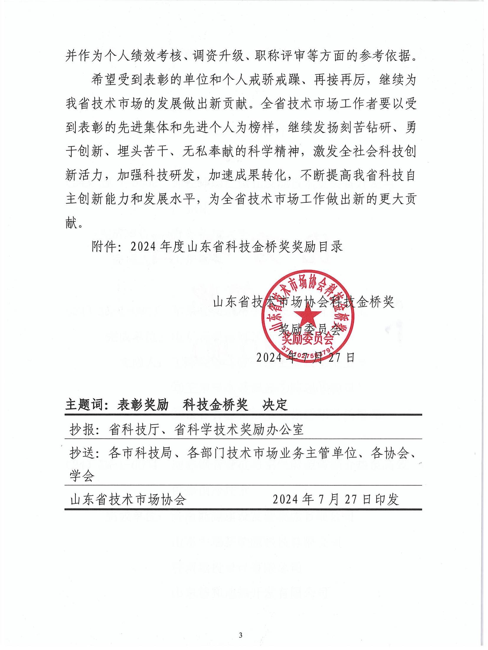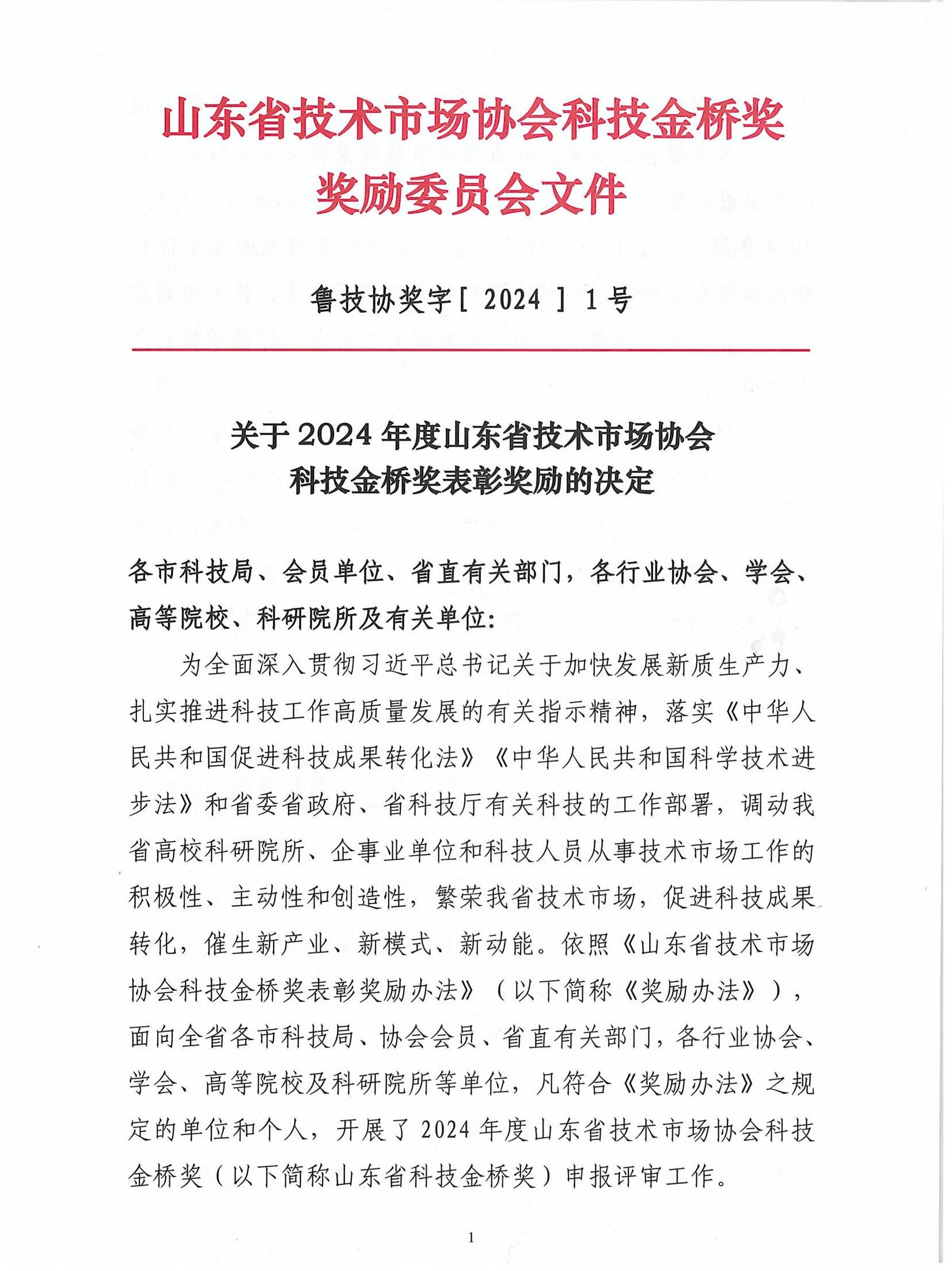 科技金桥奖是山东省科技厅备案的省内技术市场领域最高奖项,本届金桥奖重点奖励在黄河流域生态保护和发展新质生产力中推动科技成果转化、产学研合作以及为我省科技大市场建设中做出突出贡献等工作的单位、个人和项目,共评出50个优秀项目,其中一等奖10个。