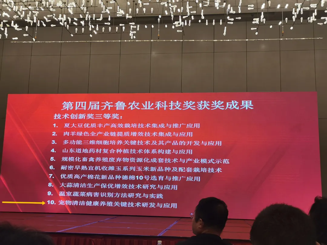 8月30日,第四届齐鲁农业科技奖奖励大会暨第二届青年学术论坛在济南召开,评选出77项2023年度齐鲁农业科技奖。山东健源生物科技有限公司与子公司山东宠言生物科技有限公司共同完成的“宠物清洁健康养殖关键技术研发与应用”项目荣获2023年度齐鲁农业科技奖技术创新奖三等奖。