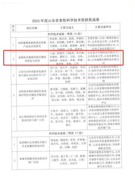 近日,山东省畜牧协会公布了2024年山东省畜牧科学技术奖获奖名单。山东健源生物科技有限公司与子公司山东宠言生物科技有限公司共同完成的“宠物清洁健康养殖关键技术研发与应用”项目,凭借其创新性与实用性,荣获山东省畜牧科学技术奖科学技术成果奖一等奖。