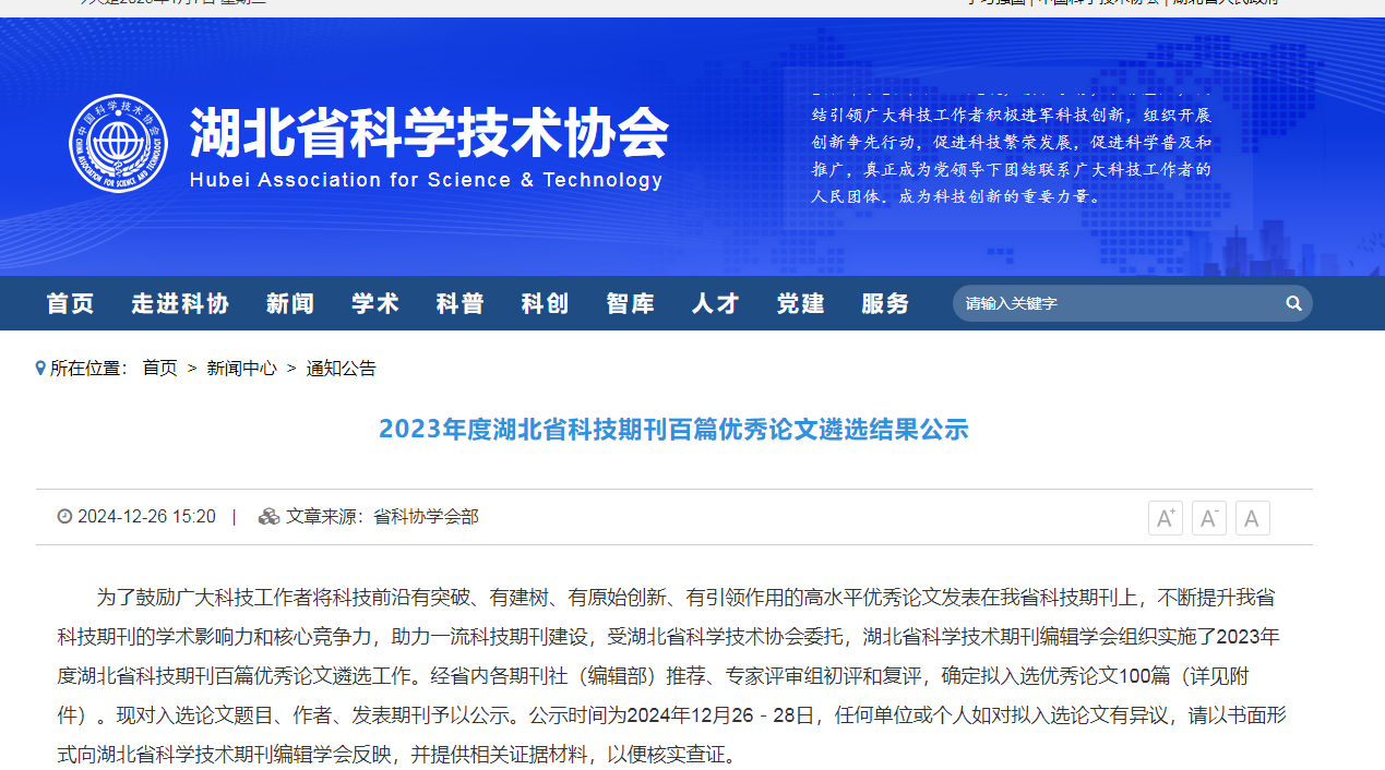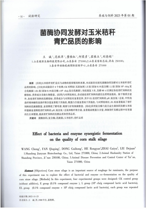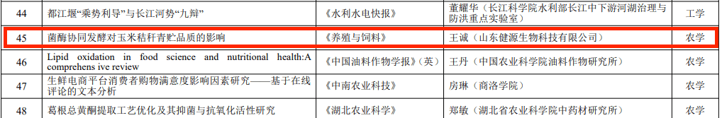 发布时间:[2025-1-15 17:6:25] 浏览量:2492次2024年12月31日,由湖北省科学技术协会指导,湖北省科学技术期刊编辑学会组织实施的2023年度湖北省科技期刊百篇优秀论文遴选结果公布,经过评选,山东健源生物科技有限公司董事长王诚带领研发团队撰写的《菌酶协同发酵对玉米秸秆青贮品质的影响》论文入选2023年度湖北省科技期刊百篇优秀论文。